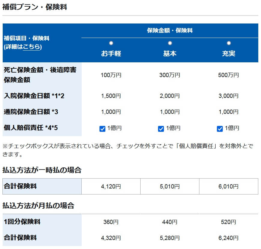 また、なぜか公式HPには家族型が存在していないのも気がかりです。個人賠償責任補償は個人だけではなく家族にも及びますが、死亡・ケガの補償は保険加入者のみに適用されます。家族全員がケガの補償を受けるには個別に加入するしかない可能性があります。