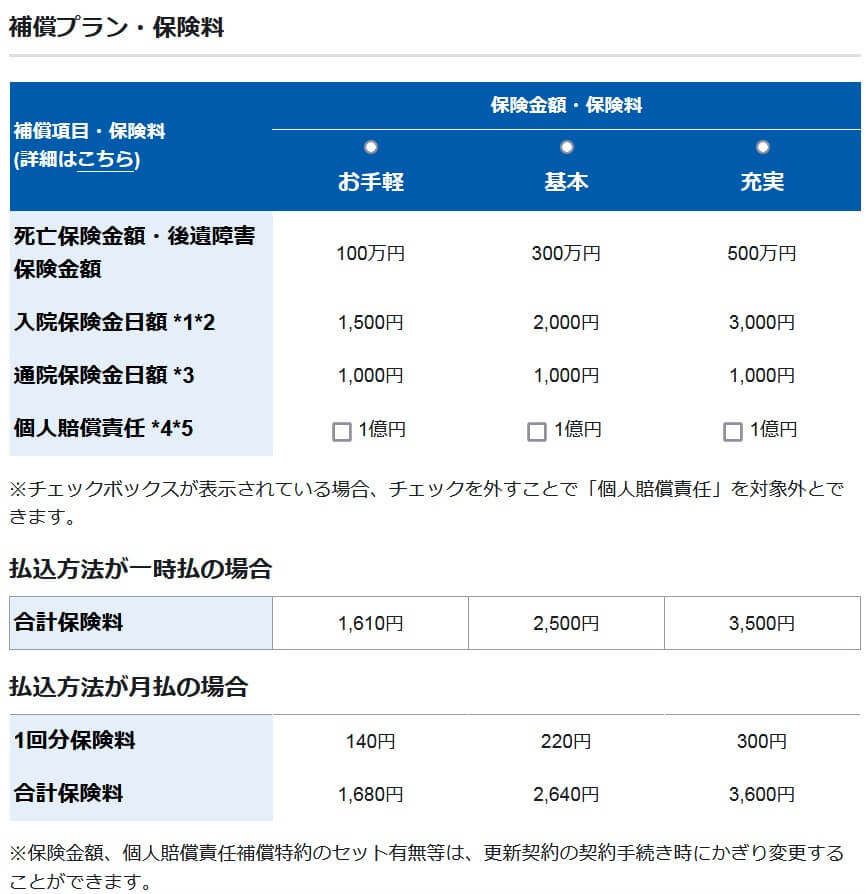 この保険の保険料は選択したプラン(お手軽・基本・充実)と個人賠償責任補償の有無によって異なります。保険料が最も安いお手軽プランの保険料は月額360円で、一括払いなら年間4120円で200円ほど安くなります。基本プランだと保険料は月額440円で一括払いなら年間5010円、充実プランだと保険料は月額520円で一括払いなら年間6010円となっています。