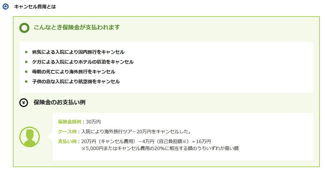 さらにメリットで既述した携行品損害の補償というオプションにも注意が必要です。意外と補償の対象外とされる物が多く、その中でも自転車・スマートフォン・メガネ・サングラスが対象外なのが痛いです。キャンセル費用の補償も便利ではありますが、5000円またはキャンセル費用の20%の自己負担額があります。キャンセル費用が20万円なら20%の4万円が自己負担となります。