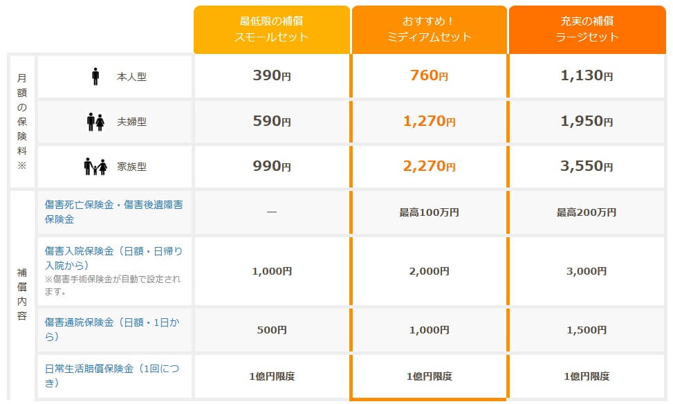 ミディアムセットだと日常生活中の事故で死亡すると死亡保険金が受け取れるようになります。事故でケガをした場合の入院保険金・通院保険金もスモールセットの2倍の額になります。ラージセットだと死亡保険金が2倍になり、入院保険金・通院保険金はミディアムセットの1.5倍(スモールセットの3倍)の額になります。