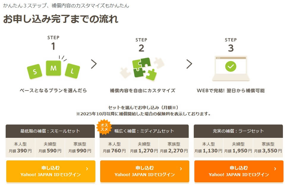 ちなみにYahoo!のIDを持っていれば加入時に個人情報の入力の手間を省けるのもメリットかもしれません。通常は加入時にはHP上で個人情報の入力が必要ですが、Yahoo!のIDでログインすれば入力が省けます。ログインして加入手続きをWeb上で進めて完結させれば、最短翌日から補償が開始します。