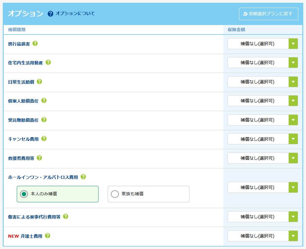 この保険の保険料は選択したセットと、補償される人の範囲によって異なります。セットの中ではスモールセットが最も保険料が安く、中間がミディアムセットで、ラージセットが最も高いです。補償内容は申込画面でカスタマイズできるため、オプションを付けるほど保険料は高くなります。