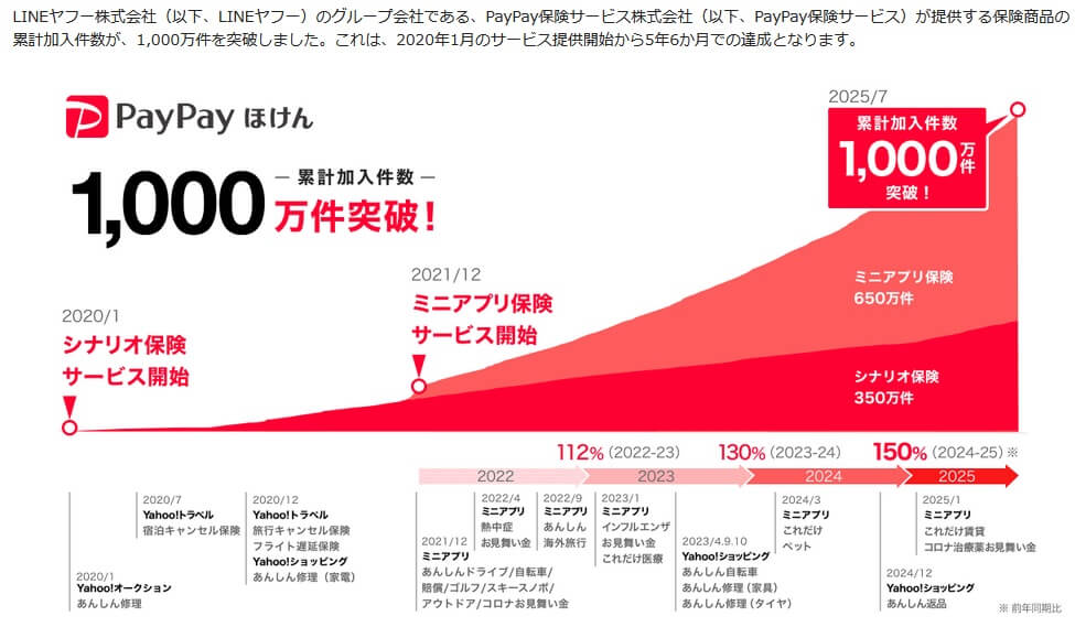 PayPay保険の決算資料によると、保険の累計加入件数は2023年末には500万件でしたが、2025年7月に1000万件を突破しました。2020年のサービス開始以来、右肩上がりで増加しているため、契約数からすると評判は良いと考えられます。