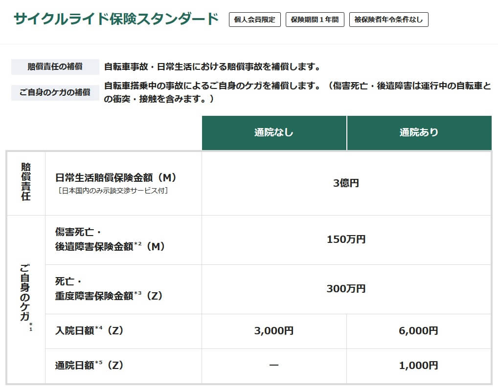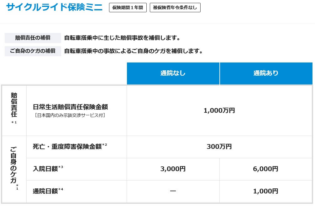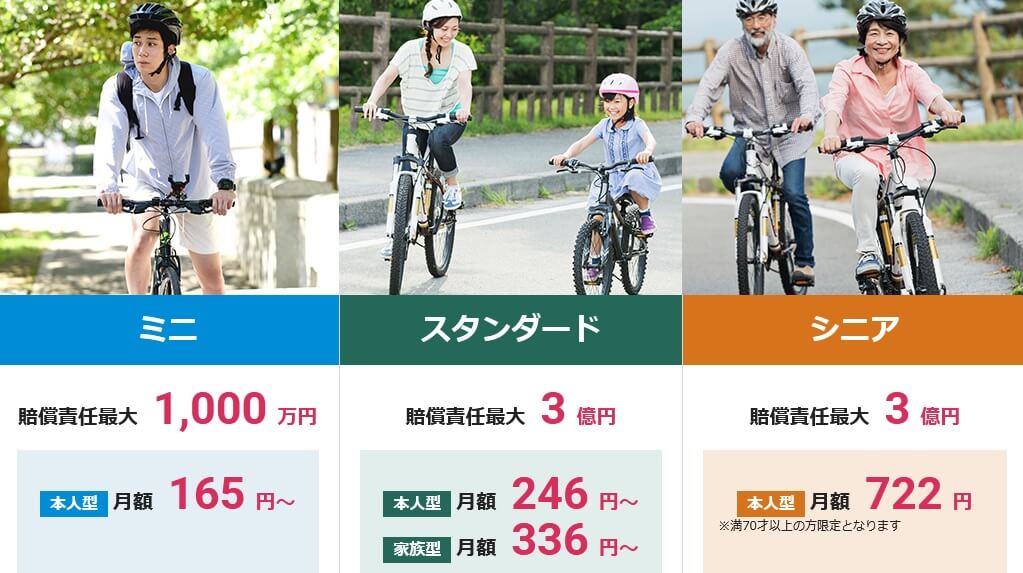 サイクルライド保険にはミニ・スタンダード・シニアの3つのプランがあります。プランによって補償内容と各保険金額が微妙に異なりますが、どのプランにも自転車ロードサービスが付けられます。ミニプランは自転車事故で死亡・入院すると保険金が受け取れ、ケガで通院すると保険金が受け取れる「通院あり」も選べます。さらに自転車事故で自分が加害者となり損害賠償を起こされた場合に、賠償額が最高1000万円まで日常生活賠償保険金として受け取れます。