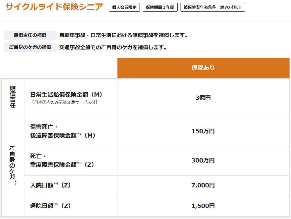 また、シニアプランがあるのも人によってはメリットでしょう。他社の自転車保険は加入できるのが69歳以下に限定しているケースが多いのですが、この保険ならシニアプランで加入できます。それもシニアプランだからといって補償が薄くはなっておらず、ケガで通院しても保険金が受け取れます。