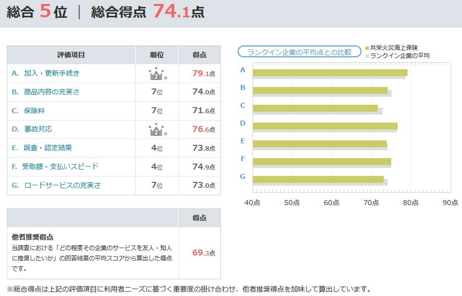 ただ、契約数でいうと価格.comの「自動車保険の満足度ランキング2025」では、共栄火災は対象企業であるものの10位以下でランキング外でした。総合ランキング以外に保険料・補償内容・顧客対応・事故対応の項目別のランキングもありますが、唯一事故対応で10位に入っているだけでした。