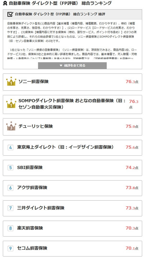 その一方で、ファイナンシャルプランナー(FP)評価では順位を7位まで落としており、専門家からの評価は低めとなっています。商品内容で6位、ロードサービスで7位、保険料で6位と評価されていません。ソニー損保はFP評価でも1位のため契約者の満足度とのズレはありませんでした。