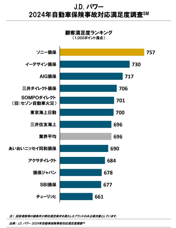 さらに調査会社のJDパワーの自動車保険契約者満足度調査2024(ダイレクト系)によると、チューリッヒは7社中で2位と満足度は高いです。この調査は契約手続き・保険料・事故対応・顧客対応等が調査項目ですが、保険料の価格についてはソニー損保を抑えて最高評価を受けていました。しかし、事故対応の満足度では最下位に沈んでいるため事故対応には不安が残ります。