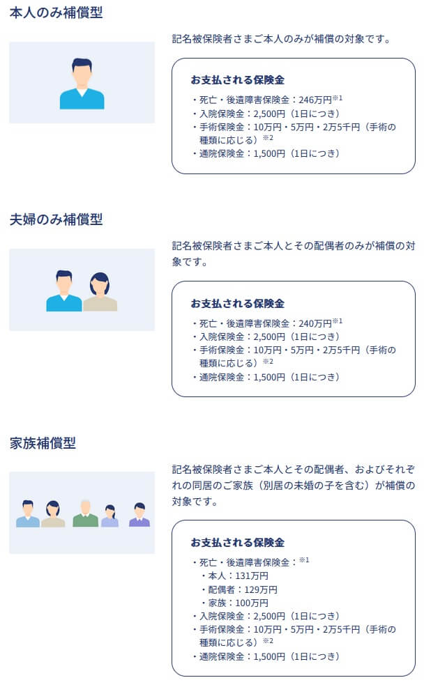 3つの型のどれを選んでも入院保険金が1日あたり2500円、通院保険金が1日あたり1500円、手術保険金が2.5~10万円なのは同じです。異なるのは死亡・後遺障害保険金の額で、本人のみ補償型は246万円と最も高く、夫婦のみ補償型は240万円に減額されます。家族補償型は本人が131万円、配偶者が129万円、家族が100万円と保険金額が分かれています。