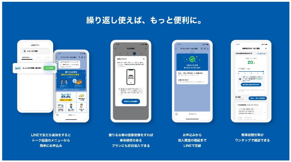 スマートフォンから24時間いつでもネットで加入でき、さらにローソン・ファミリマート・ミニストップでも契約できるのもメリットです。LINEによる契約も可能で、LINEでの契約なら車両補償ありプランに即日加入も可能となっています。スマートフォンで契約する場合、料金はクレジットカード払いの他に携帯料金と合算払いが可能なのも地味にメリットでしょう。