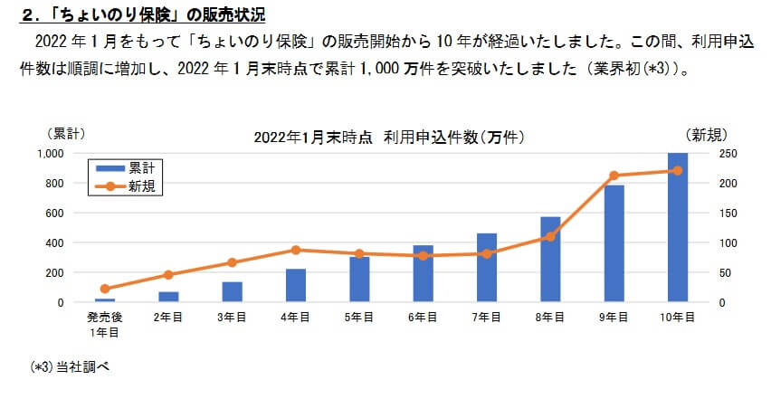 さらに、ちょいのり保険の契約数でいうと2012年の販売開始から6年後の2018年春に累計申込数が400万件を超えました。その4年後の2022年1月末時点では累計申込数は1000万件を突破し、販売開始から右肩上がりで増加しています。保険比較サイトのライフィの申込数ランキングでも、三井住友海上や損保ジャパンを抑えて1位になっていました。そのため契約数からすると評判は良いといえます。