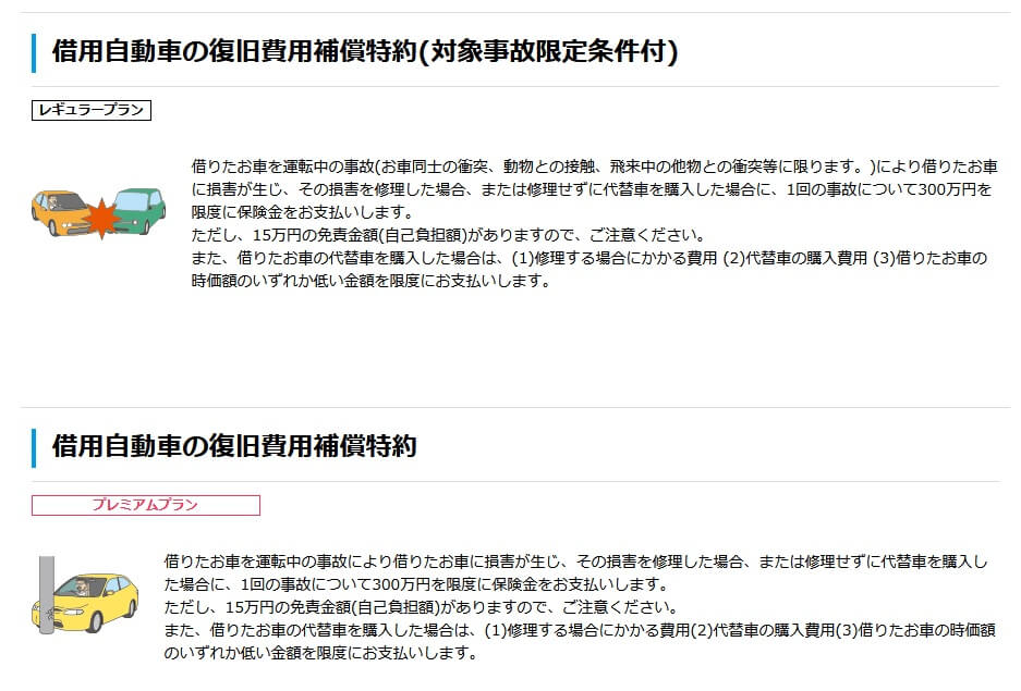 レギュラープランだと事故時の車両補償が付いてきます。車同士の事故・動物との接触・飛来物によって自動車が損壊した場合に、修理費として300万円を限度に保険金が受け取れます。15万円の免責金額(自己負担額)があるため、小さい擦り傷程度だと保険金は出ません。