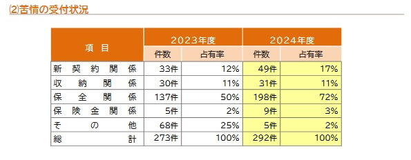 また、同社の集計によると2024年度に寄せられた苦情数は292件で、そのうち保全関係の苦情が72%と大半を占めていました。住所変更や解約などの手続きでの苦情が多いようです。次いで契約時の説明不足などの新契約関係の苦情が多いのですが、とにかく保全関係での苦情が多いのが懸念点です。