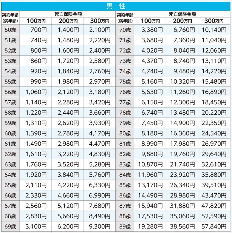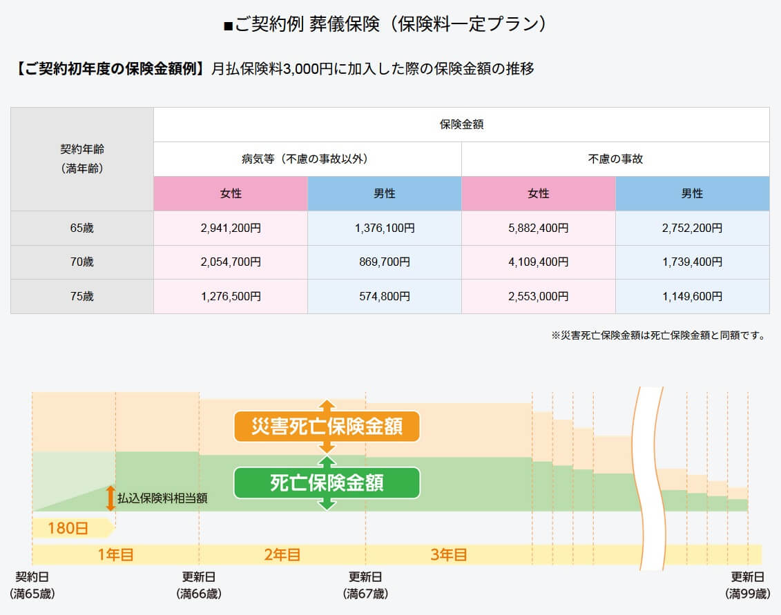 その一方で保険料一定プランは契約時から年齢を重ねても、支払う保険料は死亡するまで同じ金額です。保険料は月額2000円・3000円・5000円から選択できます。2000円コースは男性は50歳・女性は59歳から加入でき、3000円コースは男性は55歳・女性は65歳、5000円コースは男性は62歳・女性は72歳から加入できます。