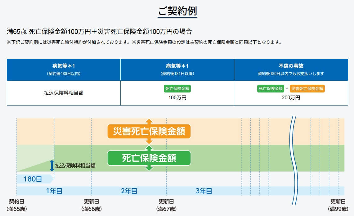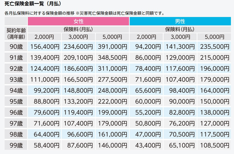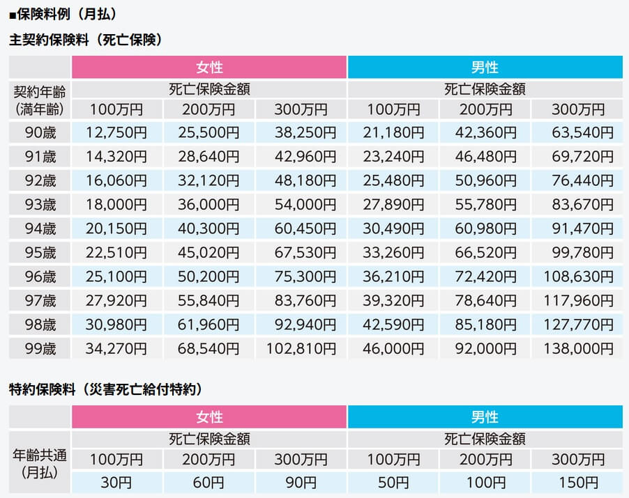 さらに、この2つのプランには災害死亡給付特約が付けられます。この特約を付けると病気・老衰等ではなく災害(不慮の事故)で死亡した場合、受け取れる保険金額が2倍になります。保険金一定プランでは死亡保険金が100万円なら200万円が受け取れます。保険料一定プランでは死亡時の減額された保険金の2倍の額が受け取れます。