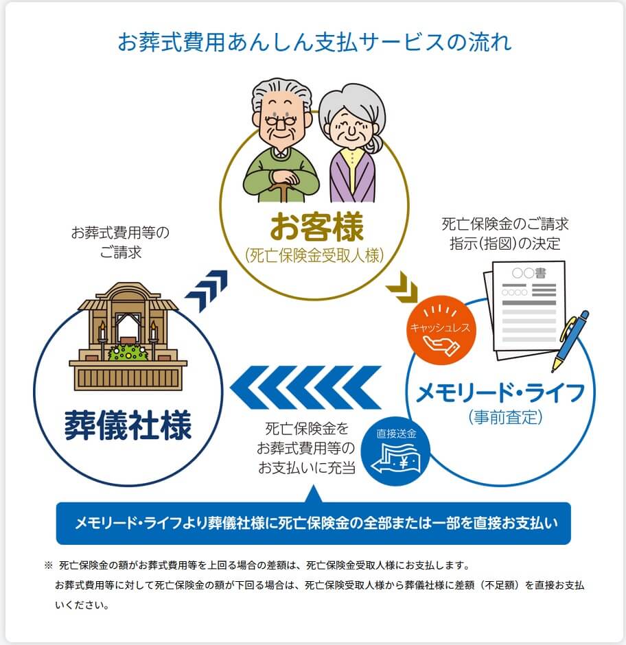 さらに、遺族が保険金を葬式費用以外に利用したり、葬式費用の支払い手続きの手間を軽減するために「お葬式費用あんしん支払サービス」があります。このサービスを利用すると死亡保険金を葬儀費用として、葬儀社にメモリード・ライフから直接支払われます。死亡した人の金融口座は相続が完了するまで凍結されるため、葬式費用を円滑に支払う意味でも利用価値があります。もちろん葬式費用に対して保険金が余れば、保険金受取人に残額が支払われます。
