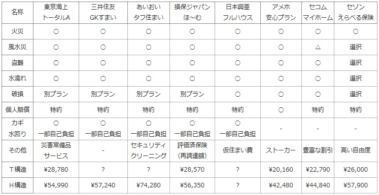 その際にはスタンダードプランを採用し、風水災・盗難・水濡れは補償内として特約は全て割愛した。※便宜上、東京海上・アメリカンホームの建物への設定額は各々1,500万・1,000万円となっているため注意してもらいたい。