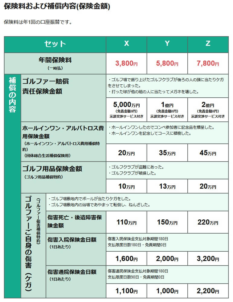 この保険にはXYZの3つのプランがありますが、どのプランでも補償内容は同じで保険金額が異なるだけです。補償内容は自分がゴルフ中に負傷した際の補償と、ゴルフに関する補償に大別されます。前者にはゴルフ中に自分が死亡・後遺障害となった場合の他、ケガで入院・通院して治療した場合も補償されます。入院・通院は日数に応じて保険金が受け取れます。