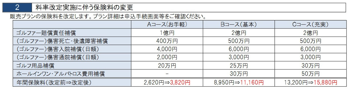 CプランはBプランと補償内容は同じですが、ゴルフ用品の補償とホールインワン等の補償の保険金の額が増額されます。それ以外の個人賠償責任補償・死亡保険金・入院保険金・通院保険金の額は据え置きとなります。