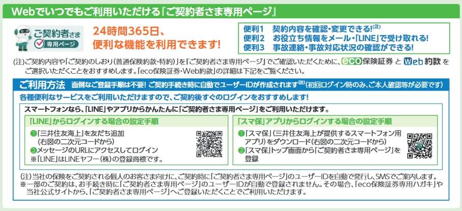 ネットで申し込みが可能な他に、三井住友海上が提供するスマートフォンアプリ「スマ保」で契約内容の確認・変更も可能です。さらに事故連絡や事故対応状況もアプリを通じて可能となっています。また、アプリをインストールするのが面倒な人のために、LINEからも契約者専用ページにログインできます。