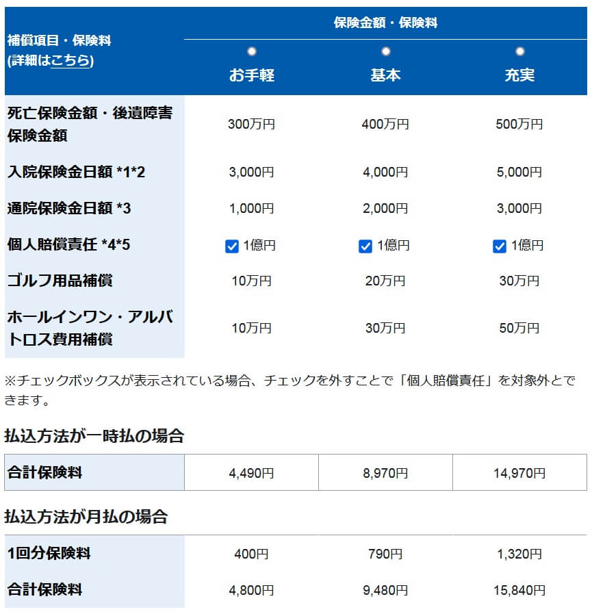 それでは以下で補償内容・保険料・メリット・デメリット・評判等を解説し、他社のゴルフ保険(ゴルファー保険)と比較していきます。