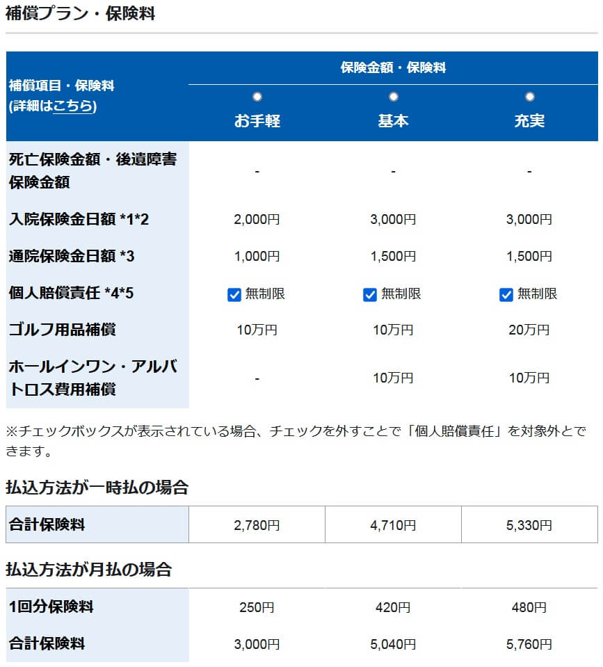 また、保険期間が1年である点もデメリットでしょう。保険料を月払いにして中途解約するという手もありますが、au損保・ドコモのワンタイム保険等では1日単位で加入できます。ドコモなら1日だけの契約なら保険料は100円で済むため、ゴルフをするのが年2~3回のライトユーザーは1日単位で加入した方が得です。