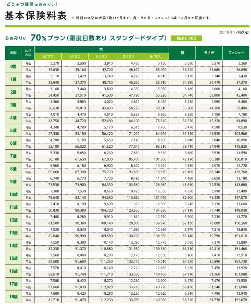この保険の保険料は犬だと品種によってA~Eクラス(Aが安く、Eが高い)に分かれ、年齢が上昇するほど高くなります。犬のクラス分けは小型犬なら必ずAクラスになるわけではなく、犬の特性も加味されているようです。例えば他社では最も保険料が安いクラスに入るトイプードルは、アニコムではBクラスに入っています。また、中型犬である甲斐犬は中型でありながらAクラスに入っています。
