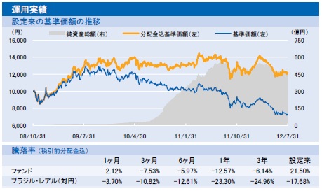 今後の見通しだが、結論から述べるとブラジル経済は綱渡りで景気を維持しているが、この投信にとっての状況は悪い。まず通貨レアルだが、2011年の景気減速で政府がレアル安に舵を切り、輸出中心の経済は復調の兆しを見せた。しかし、この投信はレアルで利益を出しても、分配時には円換算するため利益が明らかに目減りする。