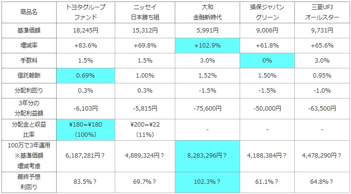 次に、他社の日本株で特定業種に投資する投信(純資産ランキングで上位)と、基準価額・手数料・利益(利益=分配金-手数料-信託報酬-信託財産留保額)分配利回り等を比較した。また、分配金のうち実際にファンドの収益が何%かも投信の健全性として比較した。さらに基準価額の増減も加味して3年後に100万円が赤字か黒字か?を計算した。その場合、過去1年間の基準価額の増減が今後3年間も繰り返し、分配金も現状維持と仮定した。計算上は「前年比で基準価額がマイナス5%なら、1~3年後も5%ずつ減額すると仮定し、3年分の分配金を足すと元金100万円はプラスか?」※増減率は基準価額が1年前から何%下落したか?を表す。一般的な騰落率とは異なる数値。信託財産留保額は投信を解約時に発生する約0.5%の費用