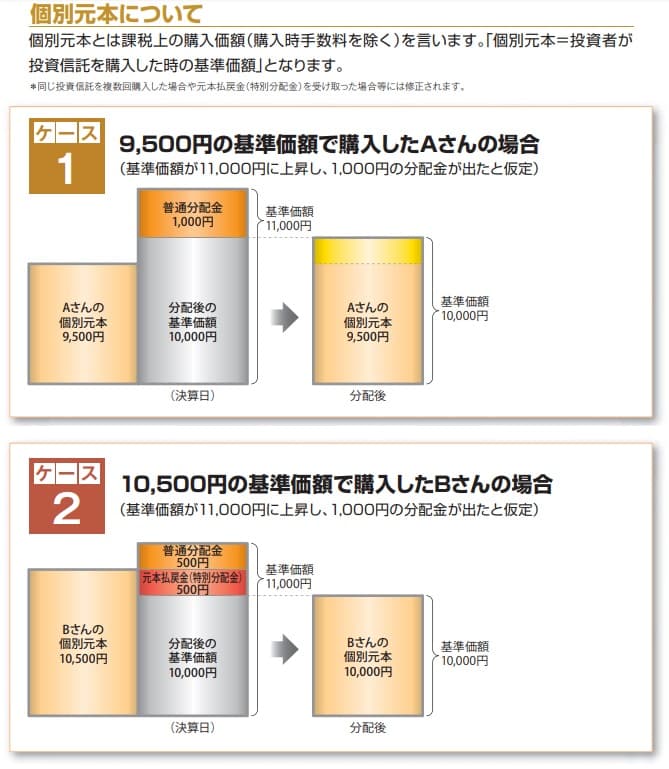 受け取る分配金が普通分配金になるか特別分配金になるかは、同じ投信を購入しても人によって違います。人によって購入時の基準価額が異なり、元本(個別元本)の金額に差があるからです。具体例で考えてみましょう。Aさんは基準価額が9500円の時、Bさんは基準価額が10500円の時に投信を購入したとします。基準価額が11000円まで上昇した決算日に2人とも1000円の分配金を受け取ると、どうなるのでしょうか?