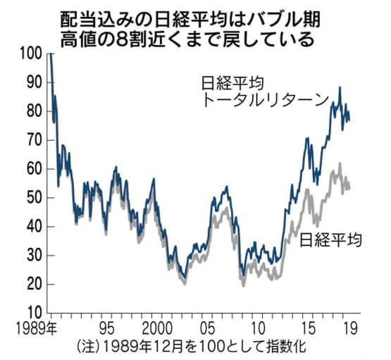 縦軸はパーセントなのですが、配当抜き日経平均だと損失が40%あるのに対して、配当込み日経平均(日経平均トータルリターン)は1989年時の80%近くまで戻しており、損失は20%まで縮んでいます。つまり配当込みの日経平均は2019年時点で3万円を突破して31165円まで戻っている計算です。