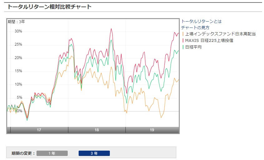 高配当の方が普通のインデックスファンドよりも良いパフォーマンスになるのでしょうか。試しに「上場インデックスファンド日本高配当」と「日経225上場投信(分配金再投資)」と日経平均を比較してみます。「日経上場投信(分配金再投資)」を配当込み日経平均と考えてください。
