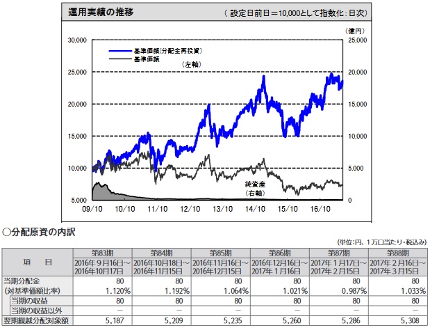 その分配金だが、数年前は120円だったが現在では80円に落ち着いている。中身を見ると当期収益から捻出しており、翌期繰越分配対象額も溜め込んで増えている。当面は分配金維持かもしれないが増配の可能性も無くはない。