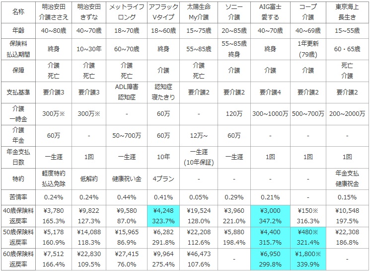 保険料は介護保険金300万円の場合の額で、他社と同じ条件ではないため金額だけでお得さは比較できない。ただ、返戻率で比較すると120%程度のため他社と比較して大してお得ではないと分かる。低解約返戻金型といえど保険料は他社より割安ではないということか。