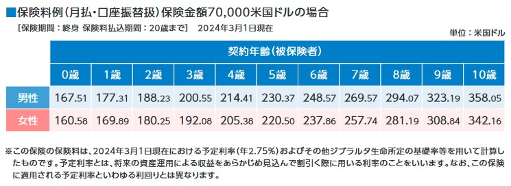 この保険で子供が0歳・保険料払込期間20年・死亡保険金7万ドルで契約すると、毎月の保険料は月額で167.51ドルです。1ドル=150円なら25126円で、毎月の為替レートにより保険料は上下します。5~6年前までは保険料は171.6ドルだったため保険料は少し安くなっています。また、保険金額を5万ドル以上で契約すると、保険料が割引される高額割引制度もあります。