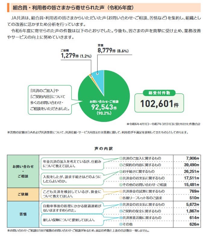 また、令和6年度にJA共済全体に寄せられた問い合わせ・相談等は10.2万件で、そのうち苦情数は8779件でした。組合員数の1021万件で割った苦情率は0.008%で、10000人の契約者のうち8人が苦情を出す程度です。苦情率は他社の0.2~0.5%より低いのですが、苦情数が前年度から倍増しているのが気がかりです。