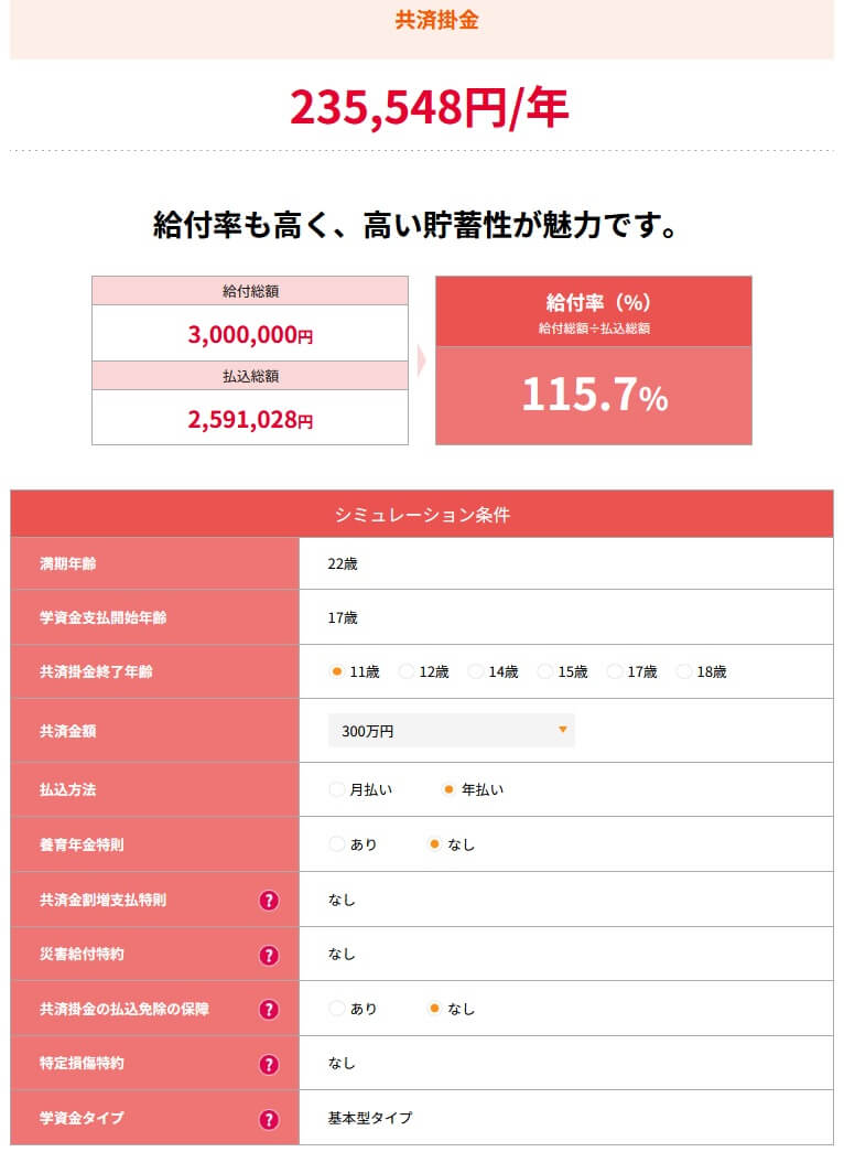 この共済は学資金型の方が祝金型よりも返戻率が高く、大学プランの方が中学プラン・高校プランよりも返戻率が高くなります。学資金開始年齢17歳・掛金払込11歳まで・掛金年払い・共済金額300万円・共済掛金払込免除不担保特則ありにすると、掛金は年間で235548円で返戻率は115.7%になります。掛金を年払いではなく月払いにすると返戻率は112.8%に低下しますが、返戻率は100%を上回ります。