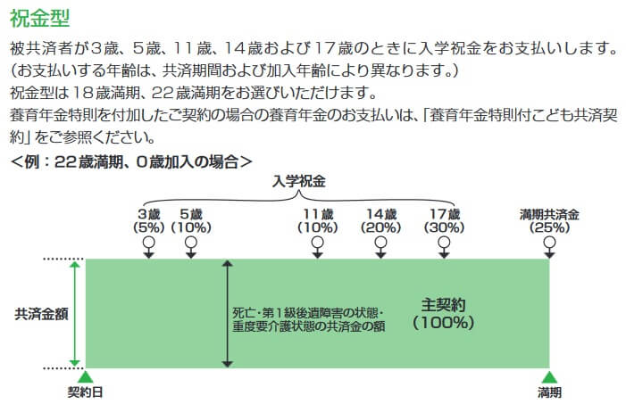 この共済には祝金型と学資金型の2つのタイプがあり、タイプによって教育資金の受け取り時期が異なります。祝金型は子供が18歳になるまで保険料を支払い、3歳・5歳・11歳・14歳・17歳時に入学祝金が受け取れます。そして、18歳満期を選ぶと18歳時に満期共済金が受け取れ、22歳満期を選ぶと22歳時に満期共済金を受け取って保険は消滅します。
