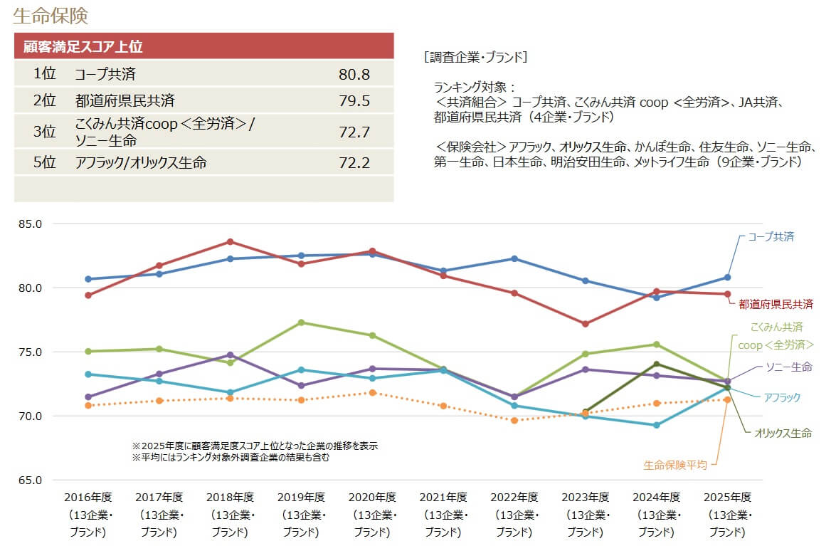 JA共済が発表した数字の他に、客観的なデータとして経産省・サービス産業生産性協議会の「2025年度 JCSI日本版顧客満足度指数調査(第4回)」があります。この調査は10万人が調査対象となっており、他の共済も調査対象に含まれています。