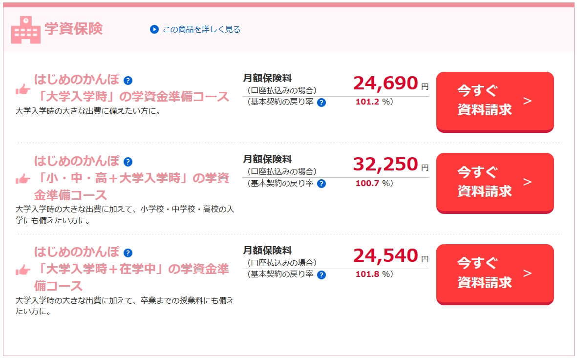 それでは以下で保障内容・返戻率・評判等を解説し、他社の学資保険・こども保険と比較して評価していきます。