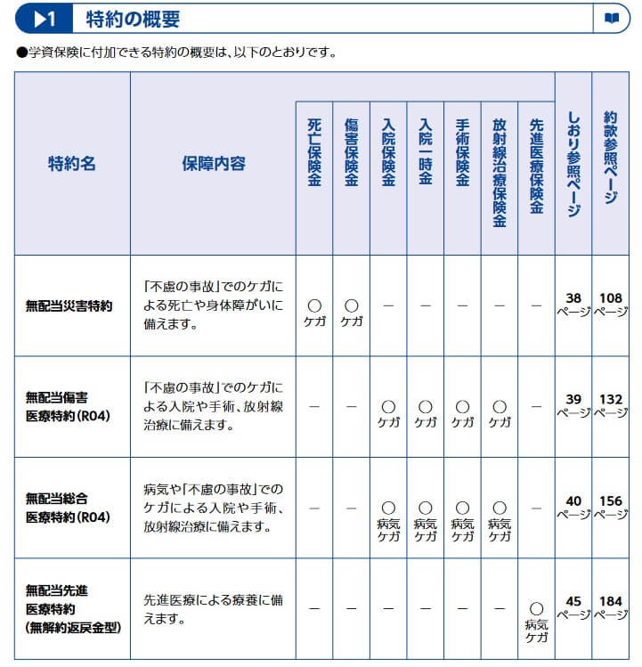 主契約(学資金と子供の死亡保障)の他に、無配当災害特約・傷害医療特約・総合医療特約・先進医療特約が付けられます。無配当災害特約を付けると、子供が災害・事故で死亡すると保険金が受け取れ、傷害医療特約を付けると災害事故でケガをして入院・手術をすれば保険金が受け取れます。総合医療特約だとケガだけではなく病気で入院・手術をしても保険金が受け取れます。先進医療特約は先進医療を受けると保険金が受け取れます。