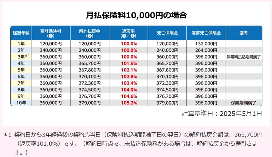 この保険の保険料は3000円・5000円・1万円・2万円・3万円の五択の中から決められます。2026年現在の返戻率は10年後の満期時で105.2%で、返戻率には保険料の額も性別・年齢も無関係です。月1万円の積み立てなら3年間で積立金は36万円になり、満期保険金は37.9万円のため1.9万円の利益が出ます。