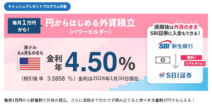 この保険のデメリットには、まずは金利で考えると銀行の外貨預金積立の方が有利である点が挙げられます。この保険の現在の予定利率は3.9%で、実際の積み立ては諸経費を引いて3.9%以下となります。それに対して、SBI新生銀行の外貨預金積立(パワービルダー)だと金利は年4.5%で、満期になればボーナス金利も付きます。死亡保障はありませんが、利益を追求するなら銀行の外貨積立を探した方が賢明です。