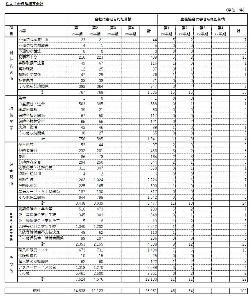 また、生命保険協会の苦情数のデータでは住友生命全体に寄せられた苦情数は25961件(2025年度上半期実績)でした。総顧客数の664万件で割った苦情率は0.39%で、契約者1000人のうち3.9件の苦情が発生している計算です。他の大手保険会社の苦情率は0.1~0.2%台のため、苦情面で考えると評判は少し悪いです。