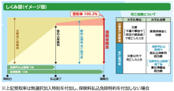 この保険の保険期間は10年で、保険に加入してから10年間のうちに死亡しなれば満期保険金が受け取れます。10年間のうちに死亡しても死亡保険金(死亡給付金)が受け取れます。災害で死亡すると満期保険金と同額の災害死亡保険金が受け取れ、災害以外で死亡しても支払った保険料と同額か上回る死亡給付金が受け取れます。