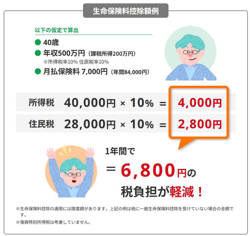 さらに生命保険料控除で税金が軽減されるのもメリットです。1年間の保険料の合計額が8万円以上なら、独身で年収300万円なら4800円、年収500万円なら6800円、年収700万円なら10800円が年末調整(自営業なら確定申告)で還付されます。還付金が受け取れるのは前半の5年間だけですが、それでも年間6800円の還付金は5年間で34000円となる計算です。