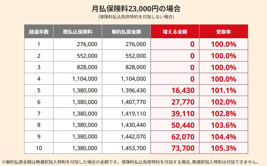 返戻率は前述したように5年が経過するまでは100%で、5年が経過して初めて100%を超えます。10年後の満期保険金の返戻率は105.3%のため、毎月の保険料が23000円なら満期保険金は約145万円になります。注意すべきは、この数字は無選択加入特則をつけた場合であり、保険料払込免除特約を付けると返戻率は著しく低下する点です。