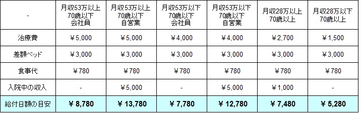 高所得者ではない月収53万円以下の一般人なら、前述の制度で月額12万円が治療費の上限となるため、12万円÷30=4,000円となる。さらに70歳以上になると、現役並みの収入(月収28万以上)があっても同じ計算で日額2,700円、月収28万以下なら日額1,500円あれば事足りる。