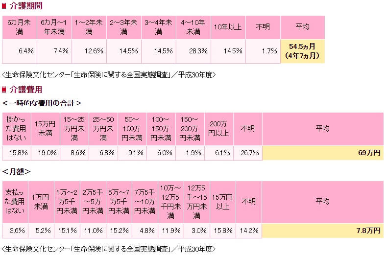 介護費用は「平成30年度 生命保険実態調査(生命保険文化センター)」によると、リフォームや介護用ベッドの購入等の一時費用で平均69万円の支出が発生しています。それとは別に月額で平均7.8万円が必要で、それが平均介護期間の54.5ヶ月(4年7ヶ月)は続くことになります。