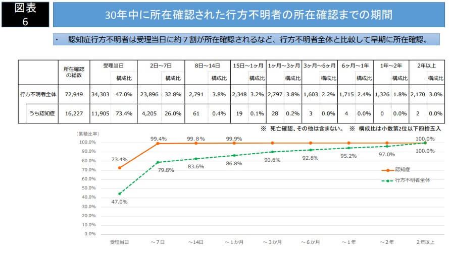 警察庁が発表した「平成30年における行方不明者の状況について」によると、認知症の人の行方不明者数は年間で約17,000件もあります。そのうちの73%が警察に届出を出した日に所在が確認されていますが、26%は2~7日後に所在が確認されています。その間に事故に巻き込まれたりトラブルを起こす可能性は否定できません。